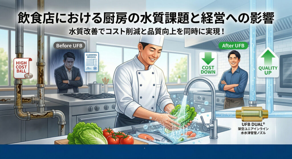 【飲食店における厨房の水質課題と経営への影響】 飲食店の経営において、厨房の水質は売上や顧客満足度に直結する重要な要素です。しかし、多くの店舗では水質に起因する様々な問題に頭を悩ませているのが現状です。 清潔な飲食店の厨房 厨房で使用する水... -