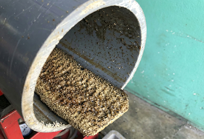 UFB水の通水開始から約100時間後、配管内を塞ぐほど固着していた尿石が、ボロボロと剥がれ落ちるように排出されました。汚れを少しずつ溶かすのではなく、配管と汚れの隙間に気泡が入り込み「根こそぎ剥離」させたことで、配管は新品同様の状態に。配管交換コストの大幅削減と、異臭問題の根本解決が実証されました。
